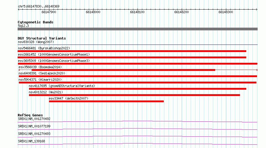 Variant DetailsVariant: esv3605309| Internal ID | 6992332 | | Landmark | | | Location Information | | | Cytoband | 5q12.3 | | Allele length | | Assembly | Allele length | | hg38 | 540 | | hg19 | 540 |