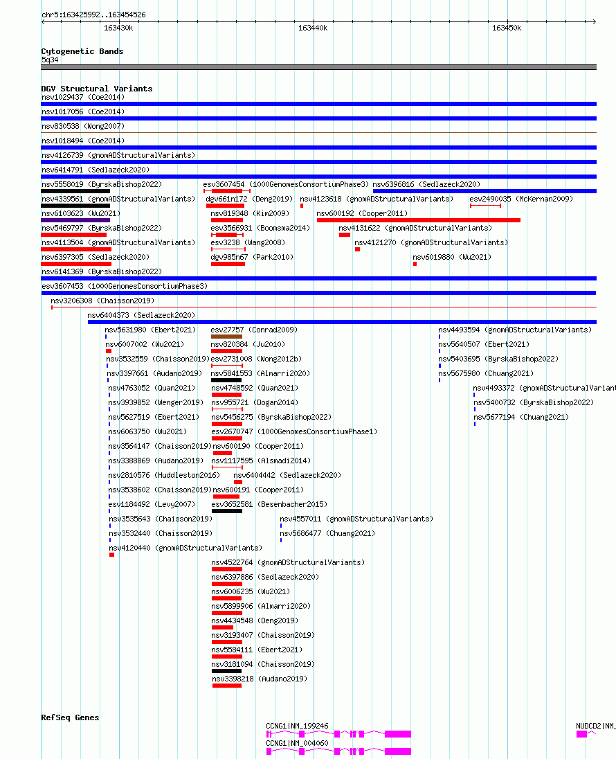 | | Variant Type | CNV gain | | Copy Number | | | Allele State | | | Allele Origin | | | Probe Count | | | Validation Flag | | | Merged Status | M | | Merged Variants | | | Supporting Variants | essv12122338 | | Samples | HG02147 | | Known Genes | CCNG1, NUDCD2 | | Method | Sequencing | | Analysis | | | Platform | Multiple platforms | | Comments | | | Reference | 1000_Genomes_Consortium_Phase_3 | | Pubmed ID | 21293372 | | Accession Number(s) | esv3607453