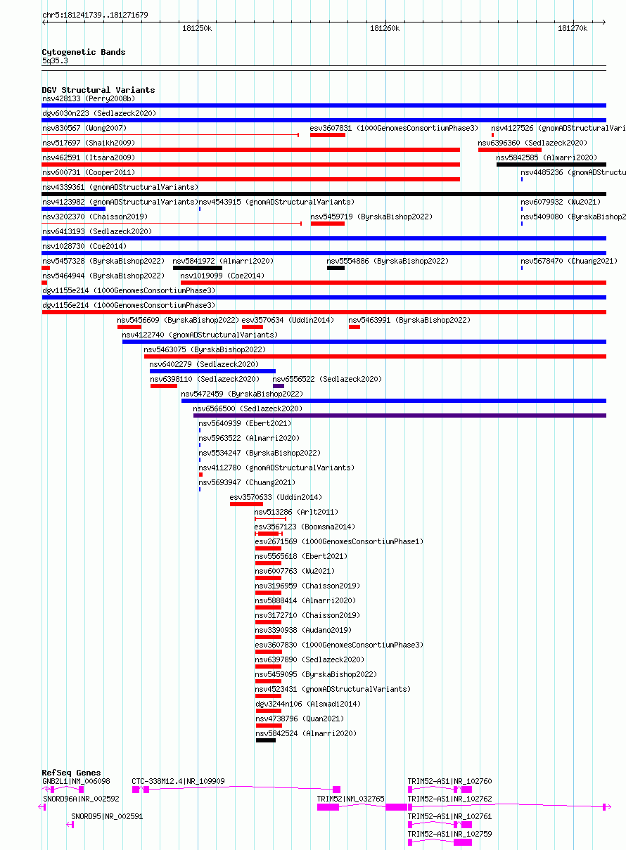 | | Variant Type | CNV loss | | Copy Number | | | Allele State | | | Allele Origin | | | Probe Count | | | Validation Flag | | | Merged Status | M | | Merged Variants | dgv1156e214 | | Supporting Variants | essv12158589 | | Samples | HG01678 | | Known Genes | GNB2L1, SNORD95, SNORD96A, TRIM52, TRIM52-AS1 | | Method | Sequencing | | Analysis | | | Platform | Multiple platforms | | Comments | | | Reference | 1000_Genomes_Consortium_Phase_3 | | Pubmed ID | 21293372 | | Accession Number(s) | esv3607826