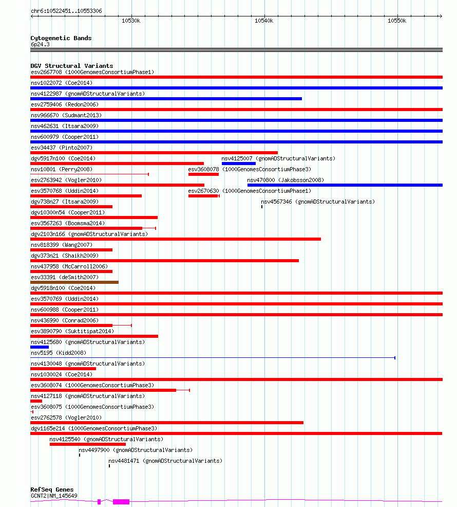 | Variant Type | CNV loss | Copy Number | | Allele State | | Allele Origin | | Probe Count | | Validation Flag | | Merged Status | M | Merged Variants | dgv1165e214 | Supporting Variants | essv12188406, essv12188405 | Samples | HG03857, HG02292 | Known Genes | GCNT2 | Method | Sequencing | Analysis | | Platform | Multiple platforms | Comments | | Reference | 1000_Genomes_Consortium_Phase_3 | Pubmed ID | 21293372 | Accession Number(s) | esv3608077