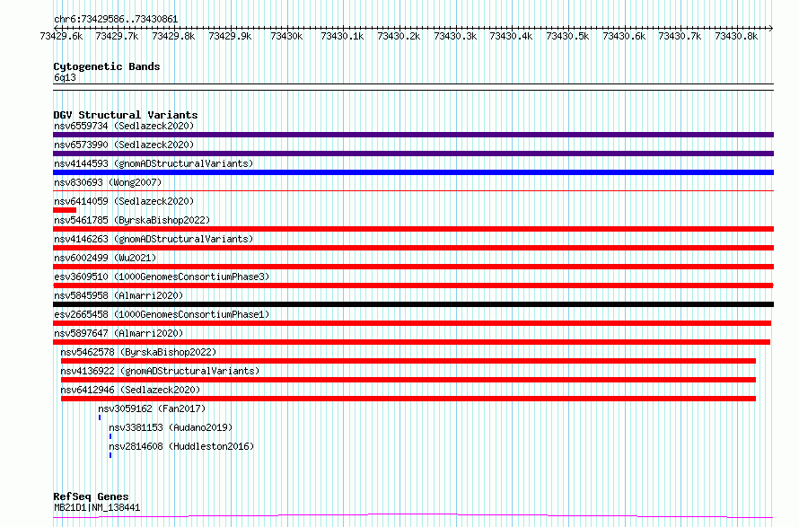 Variant DetailsVariant: esv3609510| Internal ID | 6996431 | | Landmark | | | Location Information | | | Cytoband | 6q13 | | Allele length | | Assembly | Allele length | | hg38 | 1276 | | hg19 | 1276 |