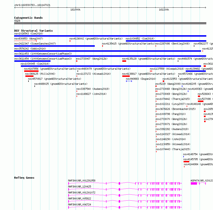 | | Variant Type | CNV gain | | Copy Number | | | Allele State | | | Allele Origin | | | Probe Count | | | Validation Flag | | | Merged Status | M | | Merged Variants | | | Supporting Variants | essv12617302, essv12617301 | | Samples | HG00277, HG00339 | | Known Genes | AGPAT4, MAP3K4 | | Method | Sequencing | | Analysis | | | Platform | Multiple platforms | | Comments | | | Reference | 1000_Genomes_Consortium_Phase_3 | | Pubmed ID | 21293372 | | Accession Number(s) | esv3611453
