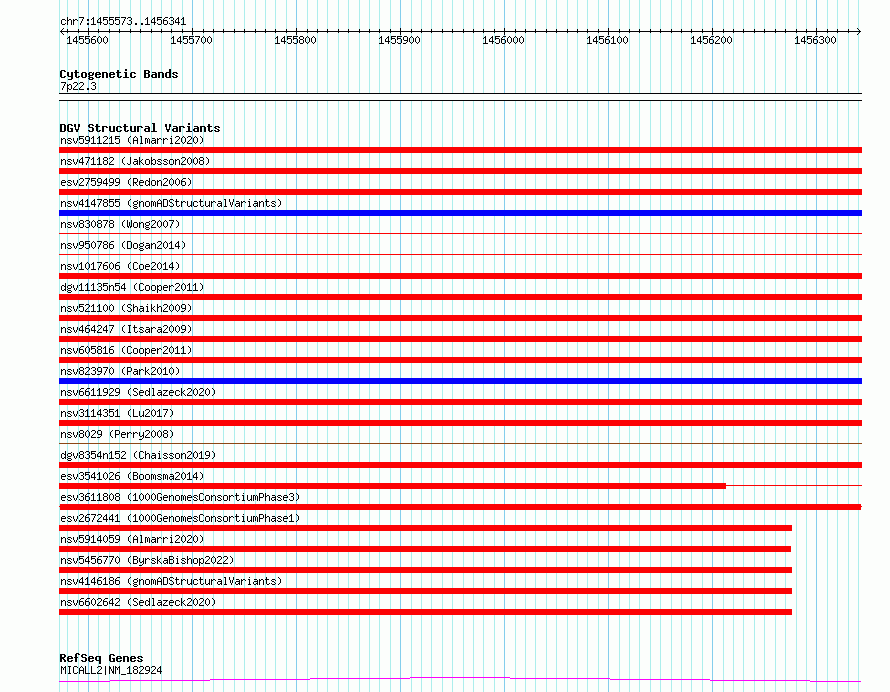 | | Variant Type | CNV loss | | Copy Number | | | Allele State | | | Allele Origin | | | Probe Count | | | Validation Flag | | | Merged Status | M | | Merged Variants | | | Supporting Variants | essv12664494, essv12664480, essv12664483, essv12664489, essv12664482, essv12664478, essv12664492, essv12664488, essv12664484, essv12664476, essv12664481, essv12664495, essv12664497, essv12664493, essv12664485, essv12664475, essv12664479, essv12664487, essv12664491, essv12664496, essv12664490, essv12664477, essv12664486 | | Samples | HG01060, HG00640, HG01704, HG01779, NA07347, NA12761, NA11930, NA20819, NA20318, HG02233, HG01122, HG00245, HG00263, NA21112, NA06985, HG01988, NA21117, NA20801, HG00119, HG01620, HG01631, NA12006, HG01976 | | Known Genes | MICALL2 | | Method | Sequencing | | Analysis | | | Platform | Multiple platforms | | Comments | | | Reference | 1000_Genomes_Consortium_Phase_3 | | Pubmed ID | 21293372 | | Accession Number(s) | esv3611808