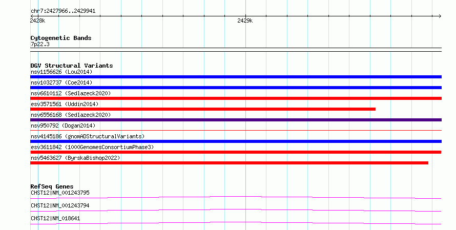 Variant DetailsVariant: esv3611842| Internal ID | 6998744 | | Landmark | | | Location Information | | | Cytoband | 7p22.3 | | Allele length | | Assembly | Allele length | | hg38 | 1976 | | hg19 | 1976 |