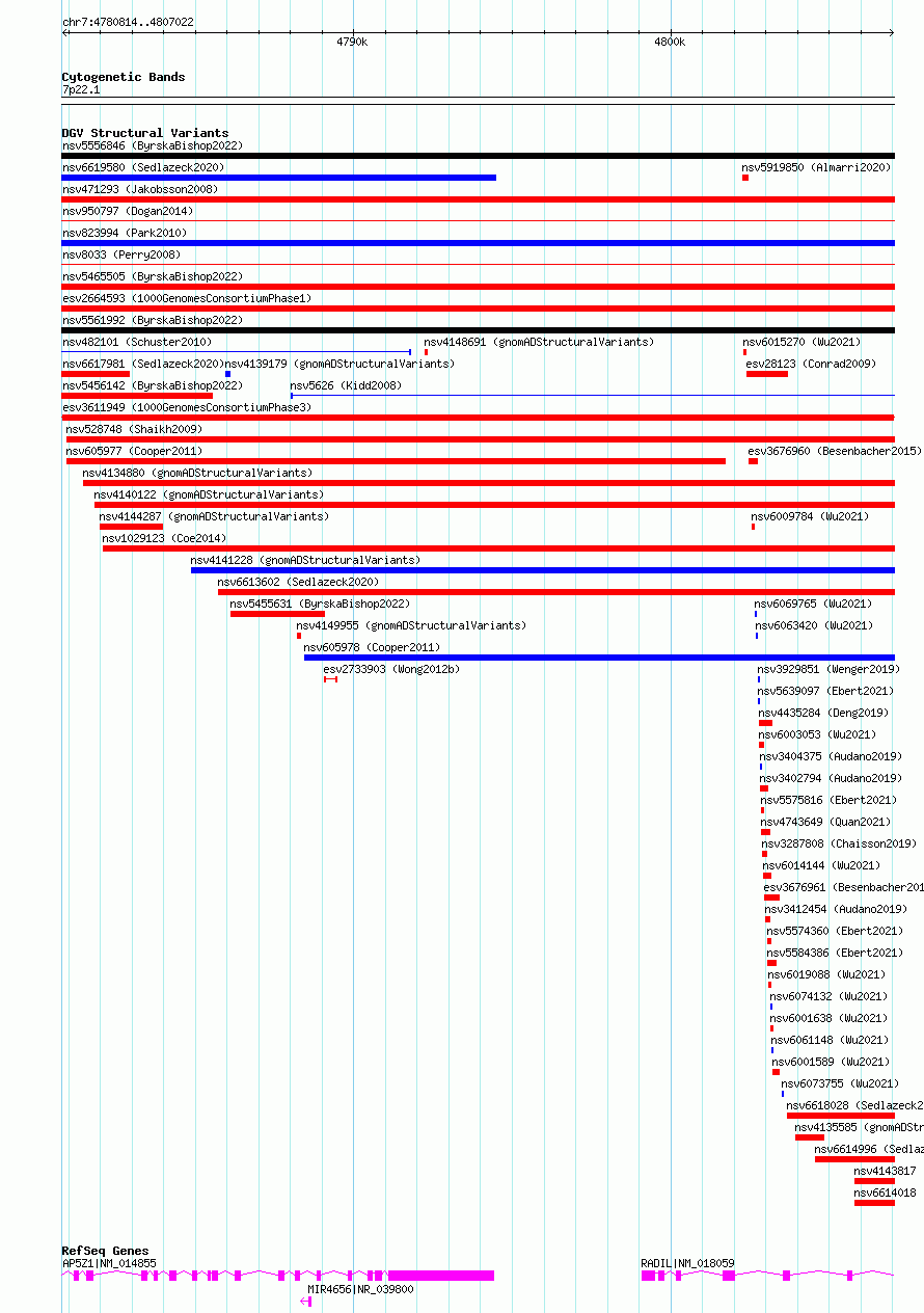 Variant DetailsVariant: esv3611949| Internal ID | 6998851 | | Landmark | | | Location Information | | | Cytoband | 7p22.1 | | Allele length | | Assembly | Allele length | | hg38 | 26209 | | hg19 | 26209 |