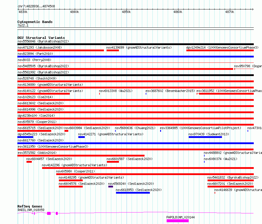 Variant DetailsVariant: esv3611950| Internal ID | 6998852 | | Landmark | | | Location Information | | | Cytoband | 7p22.1 | | Allele length | | Assembly | Allele length | | hg38 | 45573 | | hg19 | 45573 |