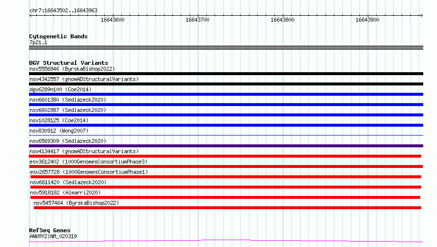 Variant DetailsVariant: esv3612402 | Internal ID | 6999303 | | Landmark | | | Location Information | | | Cytoband | 7p21.1 | | Allele length | | Assembly | Allele length | | hg38 | 462 | | hg19 | 462 |