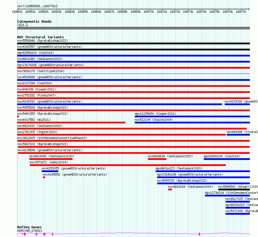Variant DetailsVariant: esv3612405| Internal ID | 6999306 | | Landmark | | | Location Information | | | Cytoband | 7p21.1 | | Allele length | | Assembly | Allele length | | hg38 | 17618 | | hg19 | 17618 |