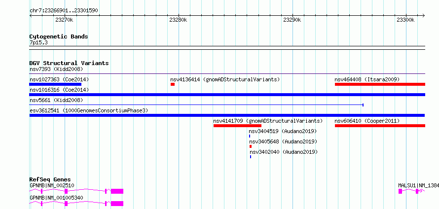 Variant DetailsVariant: esv3612541| Internal ID | 6652755 | | Landmark | | | Location Information | | | Cytoband | 7p15.3 | | Allele length | | Assembly | Allele length | | hg38 | 34690 | | hg19 | 34690 |