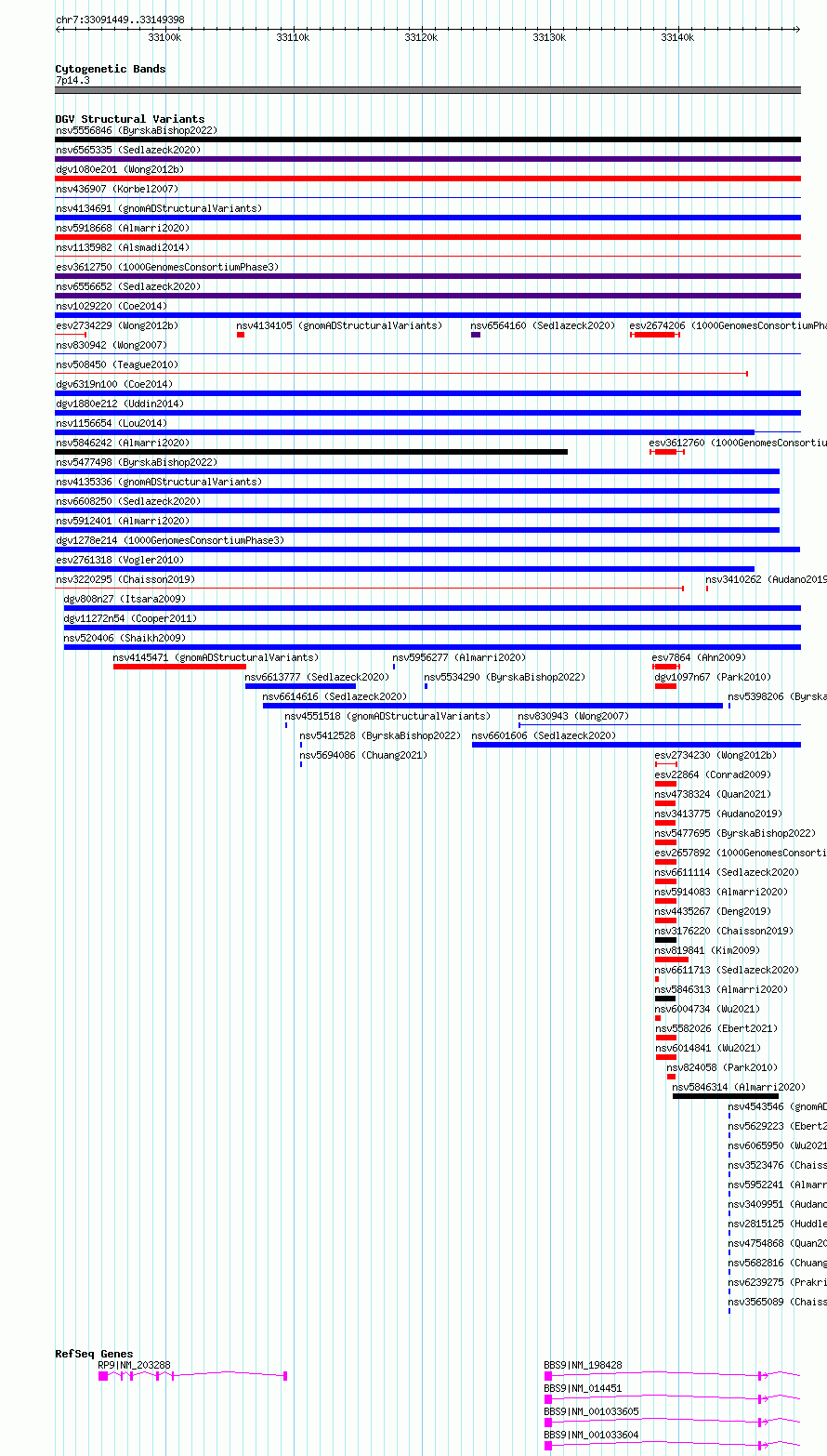 | | Variant Type | CNV gain | | Copy Number | | | Allele State | | | Allele Origin | | | Probe Count | | | Validation Flag | | | Merged Status | M | | Merged Variants | dgv1278e214 | | Supporting Variants | essv12722386, essv12722385, essv12722387 | | Samples | HG00641, HG00155, HG00353 | | Known Genes | BBS9, RP9 | | Method | Sequencing | | Analysis | | | Platform | Multiple platforms | | Comments | | | Reference | 1000_Genomes_Consortium_Phase_3 | | Pubmed ID | 21293372 | | Accession Number(s) | esv3612758