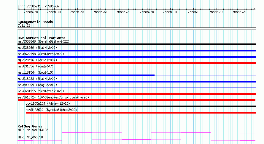 | | Variant Type | CNV loss | | Copy Number | | | Allele State | | | Allele Origin | | | Probe Count | | | Validation Flag | | | Merged Status | M | | Merged Variants | | | Supporting Variants | essv12848029, essv12848034, essv12848028, essv12848033, essv12848032, essv12848035, essv12848030, essv12848038, essv12848037, essv12848036, essv12848031 | | Samples | HG03558, HG02870, HG03069, HG03082, HG03556, HG02439, HG03382, HG03461, HG03469, HG03473, NA19116 | | Known Genes | HIP1 | | Method | Sequencing | | Analysis | | | Platform | Multiple platforms | | Comments | | | Reference | 1000_Genomes_Consortium_Phase_3 | | Pubmed ID | 21293372 | | Accession Number(s) | esv3613724