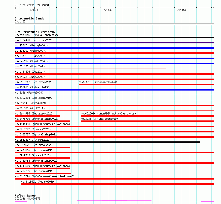 Variant DetailsVariant: esv3613790 | Internal ID | 7000685 | | Landmark | | | Location Information | | | Cytoband | 7q11.23 | | Allele length | | Assembly | Allele length | | hg38 | 2696 | | hg19 | 2696 |