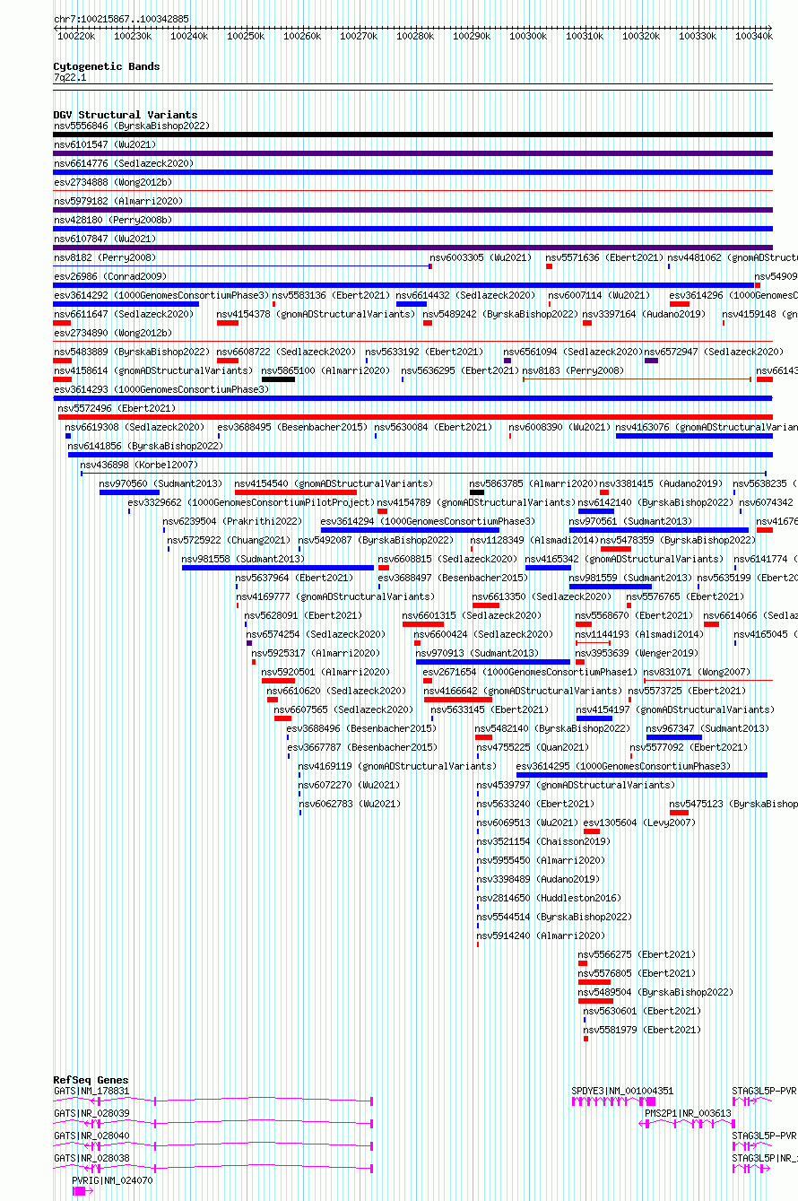 | | Variant Type | CNV gain | | Copy Number | | | Allele State | | | Allele Origin | | | Probe Count | | | Validation Flag | | | Merged Status | M | | Merged Variants | | | Supporting Variants | essv12908923 | | Samples | HG03861 | | Known Genes | GATS, PMS2P1, PVRIG, SPDYE3, STAG3L5P, STAG3L5P-PVRIG2P-PILRB | | Method | Sequencing | | Analysis | | | Platform | Multiple platforms | | Comments | | | Reference | 1000_Genomes_Consortium_Phase_3 | | Pubmed ID | 21293372 | | Accession Number(s) | esv3614293