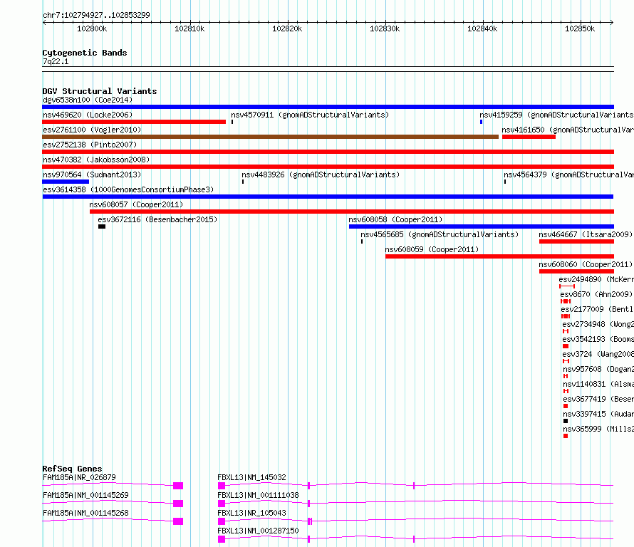 Variant DetailsVariant: esv3614358| Internal ID | 6654564 | | Landmark | | | Location Information | | | Cytoband | 7q22.1 | | Allele length | | Assembly | Allele length | | hg38 | 58373 | | hg19 | 58373 |