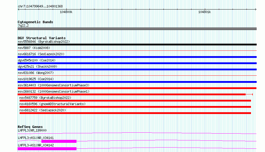 | | Variant Type | CNV loss | | Copy Number | | | Allele State | | | Allele Origin | | | Probe Count | | | Validation Flag | | | Merged Status | M | | Merged Variants | | | Supporting Variants | essv12913354, essv12913353 | | Samples | HG01198, HG01311 | | Known Genes | LHFPL3, LHFPL3-AS1 | | Method | Sequencing | | Analysis | | | Platform | Multiple platforms | | Comments | | | Reference | 1000_Genomes_Consortium_Phase_3 | | Pubmed ID | 21293372 | | Accession Number(s) | esv3614403