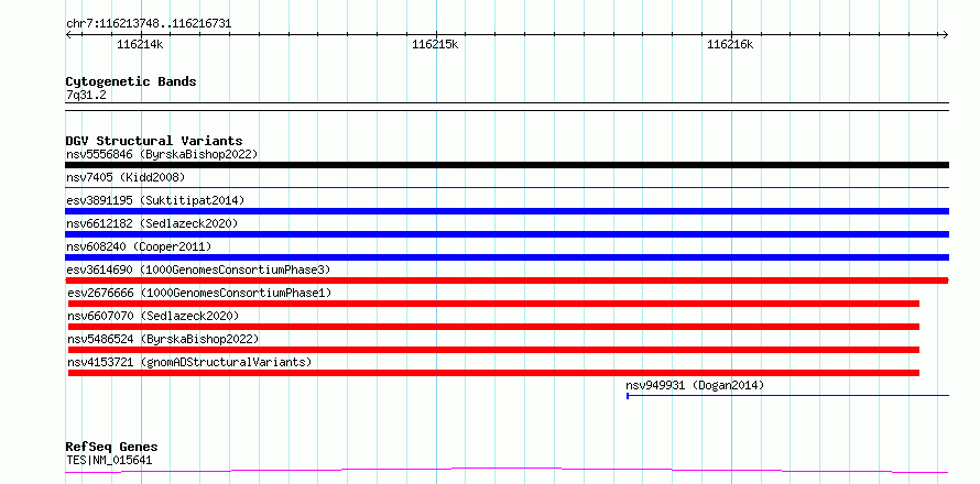 Variant DetailsVariant: esv3614690| Internal ID | 7001583 | | Landmark | | | Location Information | | | Cytoband | 7q31.2 | | Allele length | | Assembly | Allele length | | hg38 | 2984 | | hg19 | 2984 |