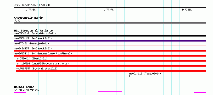 Variant DetailsVariant: esv3615402| Internal ID | 7002291 | | Landmark | | | Location Information | | | Cytoband | 7q35 | | Allele length | | Assembly | Allele length | | hg38 | 2448 | | hg19 | 2448 |