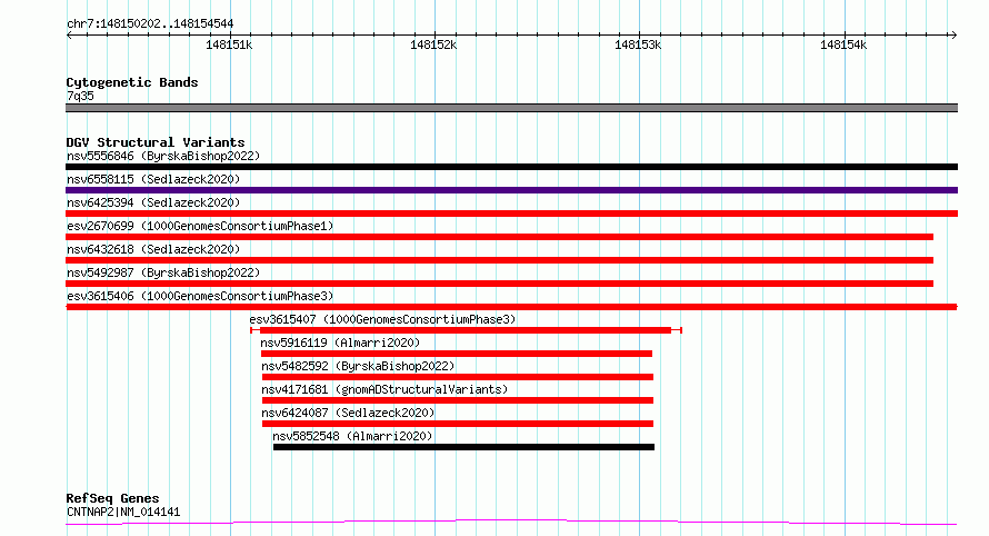 | | Variant Type | CNV loss | | Copy Number | | | Allele State | | | Allele Origin | | | Probe Count | | | Validation Flag | | | Merged Status | M | | Merged Variants | | | Supporting Variants | essv12999508, essv12999507 | | Samples | NA19446, NA19404 | | Known Genes | CNTNAP2, MIR548T | | Method | Sequencing | | Analysis | | | Platform | Multiple platforms | | Comments | | | Reference | 1000_Genomes_Consortium_Phase_3 | | Pubmed ID | 21293372 | | Accession Number(s) | esv3615406