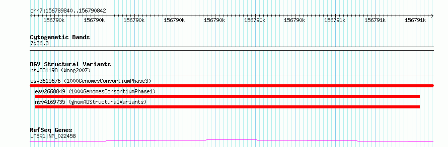 | Variant Type | CNV loss | Copy Number | | Allele State | | Allele Origin | | Probe Count | | Validation Flag | | Merged Status | M | Merged Variants | | Supporting Variants | essv13039849, essv13039845, essv13039842, essv13039838, essv13039848, essv13039850, essv13039837, essv13039836, essv13039847, essv13039854, essv13039841, essv13039846, essv13039835, essv13039853, essv13039851, essv13039839, essv13039844, essv13039852, essv13039840, essv13039843 | Samples | NA19028, NA19204, NA19399, HG03297, HG02922, HG03520, HG02427, HG03583, HG03394, HG02442, NA19236, HG02322, HG02010, HG03458, HG01958, HG02837, HG02558, HG03097, NA19213, HG03072 | Known Genes | LMBR1 | Method | Sequencing | Analysis | | Platform | Multiple platforms | Comments | | Reference | 1000_Genomes_Consortium_Phase_3 | Pubmed ID | 21293372 | Accession Number(s) | esv3615676