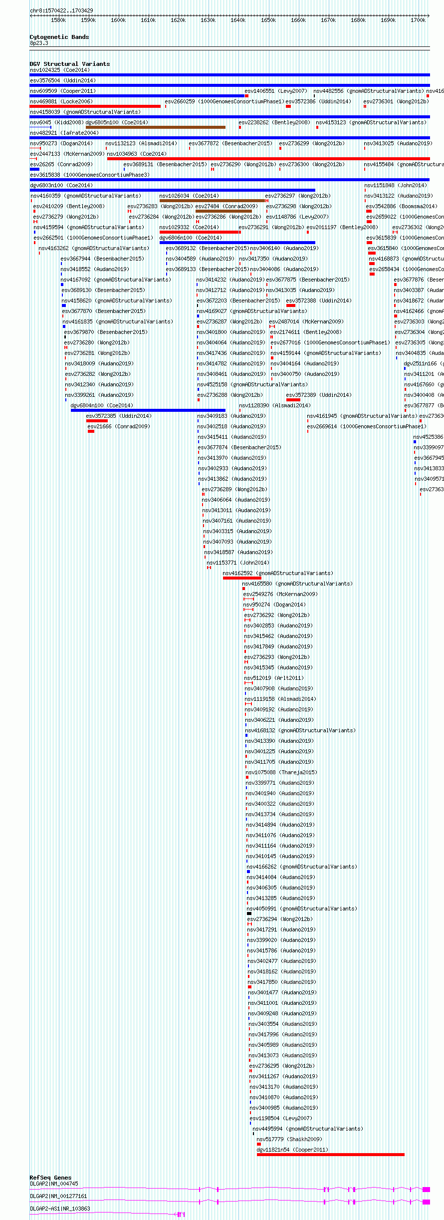 Variant DetailsVariant: esv3615838Internal ID | 6656036 | Landmark | | Location Information | | Cytoband | 8p23.3 | Allele length | Assembly | Allele length | hg38 | 133008 | hg19 | 133008 |