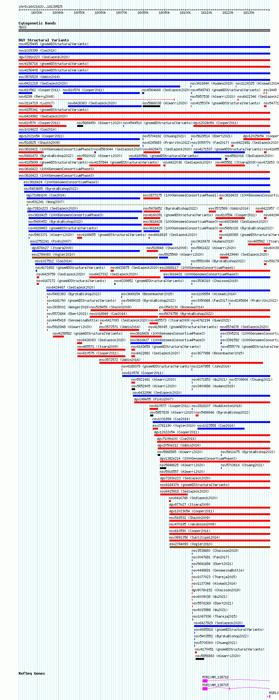 Variant DetailsVariant: esv3616422| Internal ID | 7003309 | | Landmark | | | Location Information | | | Cytoband | 8p22 | | Allele length | | Assembly | Allele length | | hg38 | 118106 | | hg19 | 118106 |