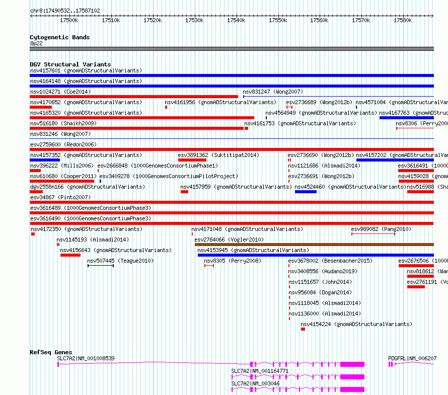 Variant DetailsVariant: esv3616490| Internal ID | 6656686 | | Landmark | | | Location Information | | | Cytoband | 8p22 | | Allele length | | Assembly | Allele length | | hg38 | 96571 | | hg19 | 96571 |