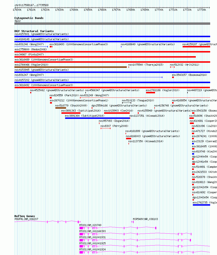 Variant DetailsVariant: esv3616492| Internal ID | 6656688 | | Landmark | | | Location Information | | | Cytoband | 8p22 | | Allele length | | Assembly | Allele length | | hg38 | 137423 | | hg19 | 137423 |