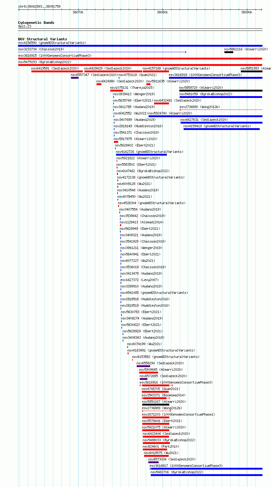Variant DetailsVariant: esv3616915| Internal ID | 7003801 | | Landmark | | | Location Information | | | Cytoband | 8p11.23 | | Allele length | | Assembly | Allele length | | hg38 | 28867 | | hg19 | 28867 |