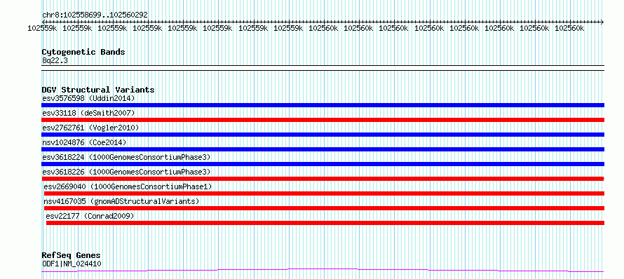 Variant DetailsVariant: esv3618226 Internal ID | 6658421 | Landmark | | Location Information | | Cytoband | 8q22.3 | Allele length | Assembly | Allele length | hg38 | 1594 | hg19 | 1594 |
