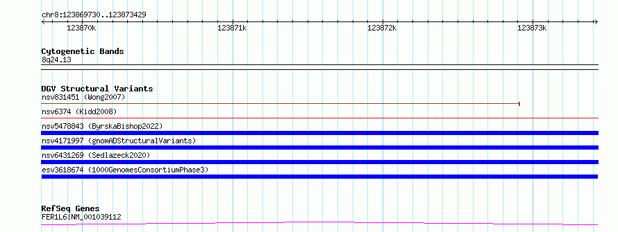 Variant DetailsVariant: esv3618674| Internal ID | 7005556 | | Landmark | | | Location Information | | | Cytoband | 8q24.13 | | Allele length | | Assembly | Allele length | | hg38 | 3700 | | hg19 | 3700 |