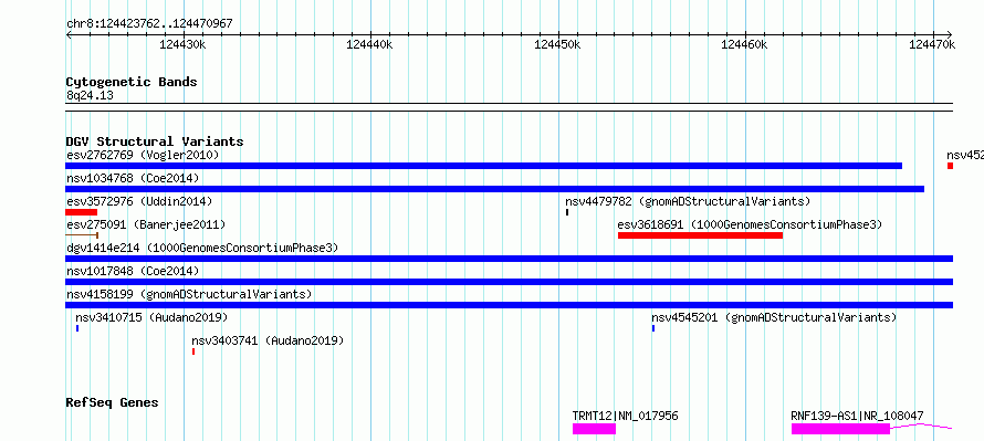 Variant DetailsVariant: esv3618690| Internal ID | 6658884 | | Landmark | | | Location Information | | | Cytoband | 8q24.13 | | Allele length | | Assembly | Allele length | | hg38 | 47206 | | hg19 | 47206 |