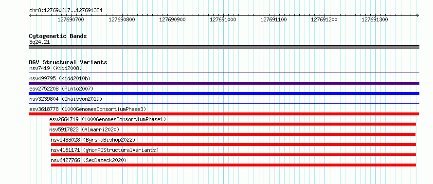 Variant DetailsVariant: esv3618778 | Internal ID | 7005660 | | Landmark | | | Location Information | | | Cytoband | 8q24.21 | | Allele length | | Assembly | Allele length | | hg38 | 768 | | hg19 | 768 |