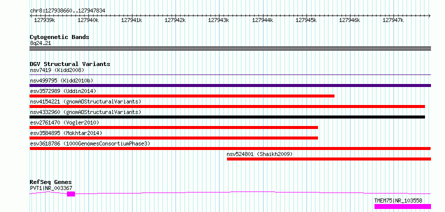 | Variant Type | CNV loss | Copy Number | | Allele State | | Allele Origin | | Probe Count | | Validation Flag | | Merged Status | M | Merged Variants | | Supporting Variants | essv13322976, essv13322975, essv13322974, essv13322973, essv13322979, essv13322977, essv13322978 | Samples | NA18530, HG01840, HG00182, HG00596, HG00428, HG02081, HG01878 | Known Genes | PVT1, TMEM75 | Method | Sequencing | Analysis | | Platform | Multiple platforms | Comments | | Reference | 1000_Genomes_Consortium_Phase_3 | Pubmed ID | 21293372 | Accession Number(s) | esv3618786
