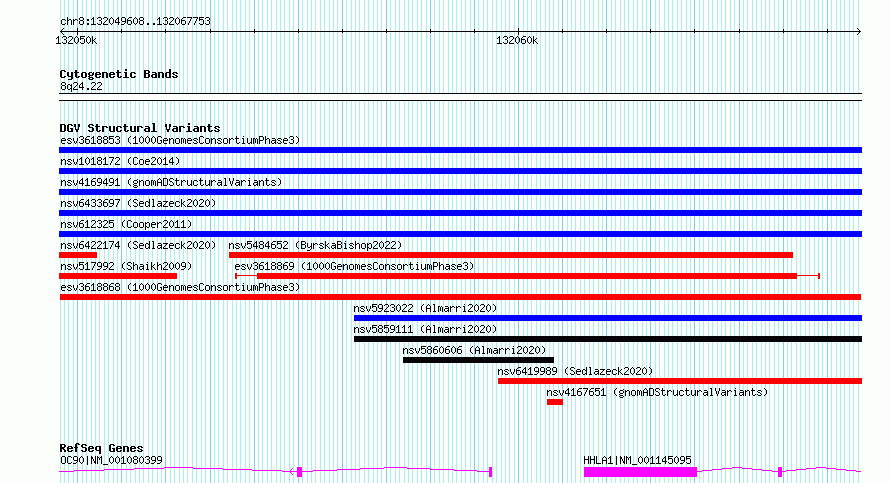 Variant DetailsVariant: esv3618868| Internal ID | 7005750 | | Landmark | | | Location Information | | | Cytoband | 8q24.22 | | Allele length | | Assembly | Allele length | | hg38 | 18146 | | hg19 | 18146 |