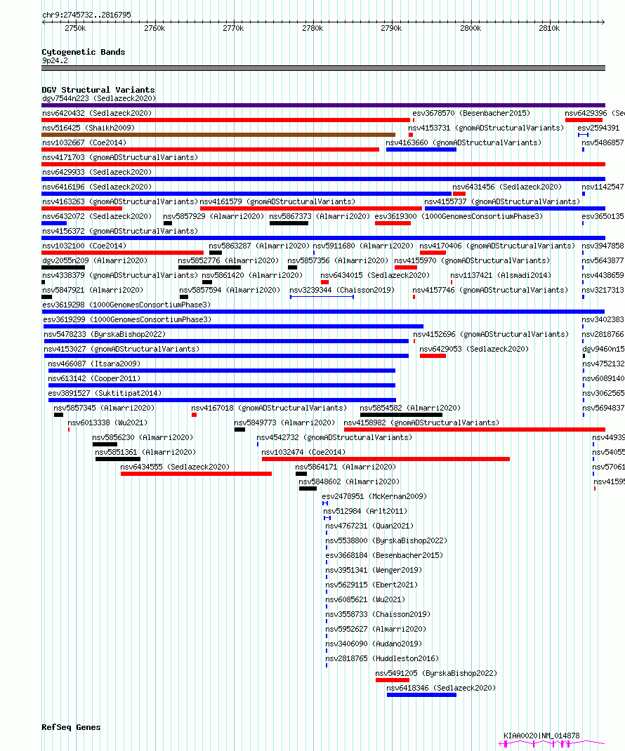 Variant DetailsVariant: esv3619298| Internal ID | 7006176 | | Landmark | | | Location Information | | | Cytoband | 9p24.2 | | Allele length | | Assembly | Allele length | | hg38 | 71064 | | hg19 | 71064 |
