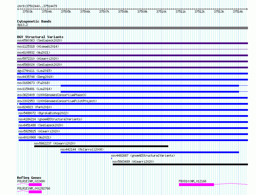 | | Variant Type | CNV gain | | Copy Number | | | Allele State | | | Allele Origin | | | Probe Count | | | Validation Flag | | | Merged Status | M | | Merged Variants | | | Supporting Variants | essv13463043, essv13463042, essv13463010, essv13463029, essv13463017, essv13463033, essv13463028, essv13463019, essv13463035, essv13463021, essv13463024, essv13463037, essv13463041, essv13463031, essv13463022, essv13463009, essv13463036, essv13463025, essv13463012, essv13463038, essv13463039, essv13463032, essv13463030, essv13463014, essv13463027, essv13463034, essv13463040, essv13463023, essv13463026, essv13463020, essv13463015, essv13463018, essv13463013, essv13463044, essv13463016, essv13463011 | | Samples | NA18592, NA18641, HG01806, HG03926, HG02050, HG02394, HG02384, HG00879, HG02153, NA18960, HG01840, HG00451, HG02138, NA19007, HG00657, HG00583, HG01796, HG00708, NA18573, HG02494, HG00684, NA18553, HG04176, NA18541, HG00407, NA18542, HG01597, NA18543, HG00625, HG01878, HG00620, HG02128, HG02032, HG01872, HG00978, NA18620 | | Known Genes | FBXO10, POLR1E | | Method | Sequencing | | Analysis | | | Platform | Multiple platforms | | Comments | | | Reference | 1000_Genomes_Consortium_Phase_3 | | Pubmed ID | 21293372 | | Accession Number(s) | esv3620409