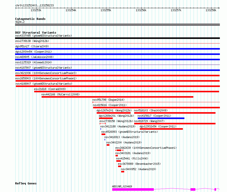 | Variant Type | CNV loss | Copy Number | | Allele State | | Allele Origin | | Probe Count | | Validation Flag | | Merged Status | M | Merged Variants | | Supporting Variants | essv13639280, essv13639274, essv13639279, essv13639270, essv13639285, essv13639286, essv13639278, essv13639268, essv13639277, essv13639273, essv13639267, essv13639284, essv13639271, essv13639269, essv13639276, essv13639275, essv13639283, essv13639281, essv13639272, essv13639282 | Samples | HG03559, HG03378, HG03074, HG03246, HG02111, HG01369, HG01308, NA18520, NA19152, NA19043, NA19982, HG03446, HG02283, HG03567, NA19375, NA18909, NA19149, NA19102, HG01914, HG01566 | Known Genes | ABO | Method | Sequencing | Analysis | | Platform | Multiple platforms | Comments | | Reference | 1000_Genomes_Consortium_Phase_3 | Pubmed ID | 21293372 | Accession Number(s) | esv3621936