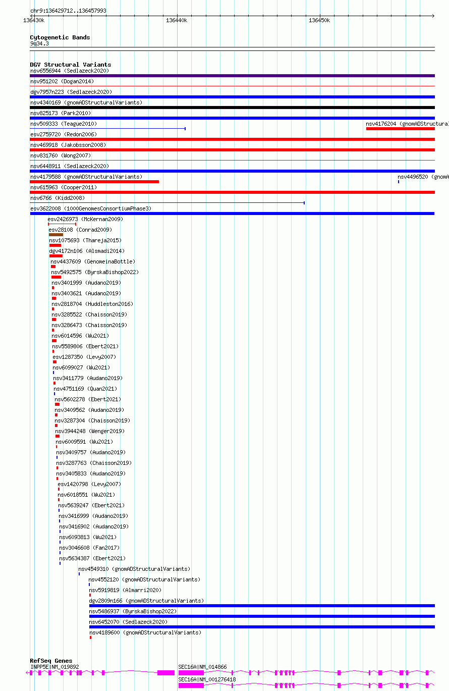 Variant DetailsVariant: esv3622008| Internal ID | 7008870 | | Landmark | | | Location Information | | | Cytoband | 9q34.3 | | Allele length | | Assembly | Allele length | | hg38 | 28282 | | hg19 | 28282 |