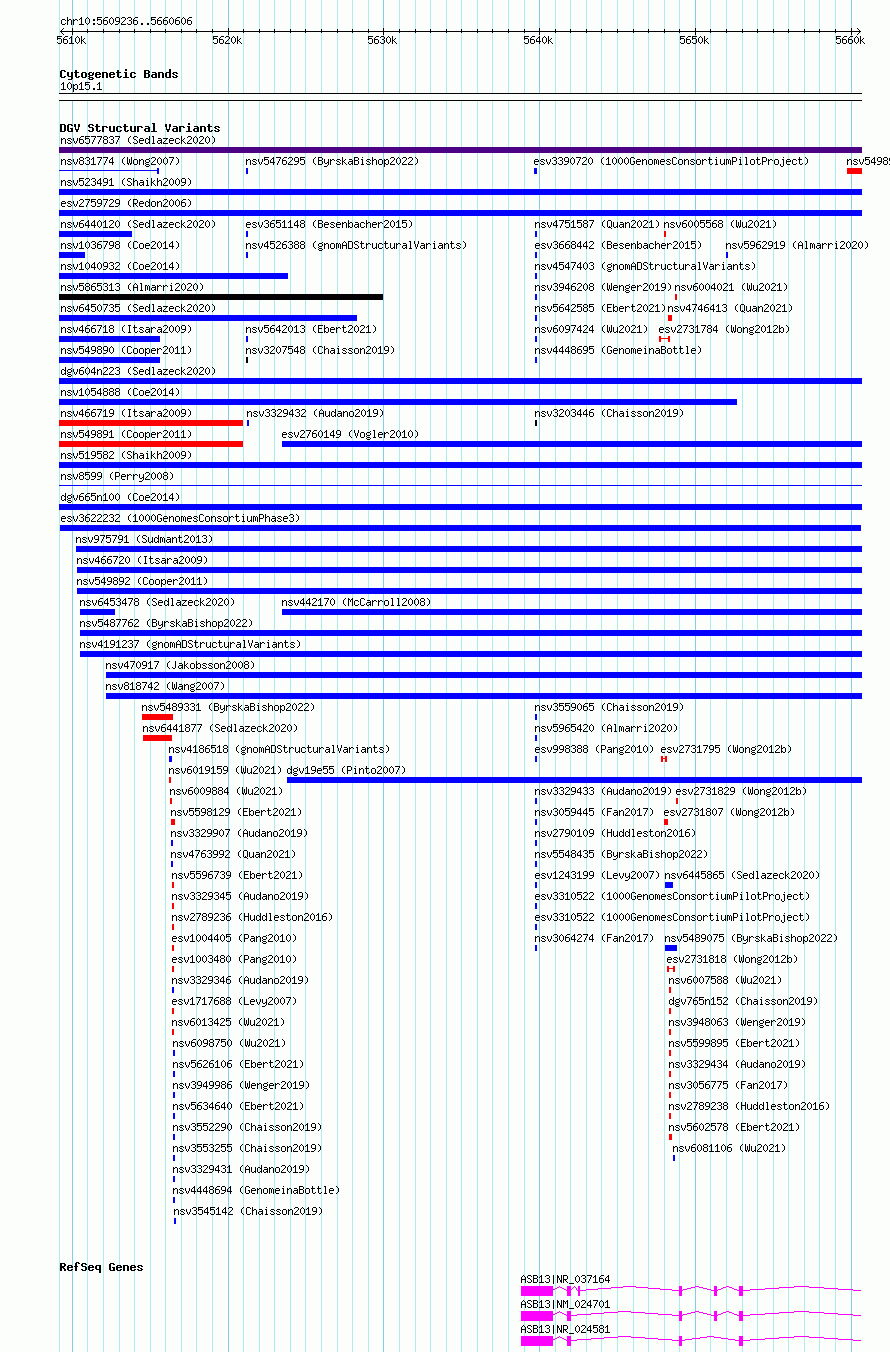 Variant DetailsVariant: esv3622232| Internal ID | 7009091 | | Landmark | | | Location Information | | | Cytoband | 10p15.1 | | Allele length | | Assembly | Allele length | | hg38 | 51371 | | hg19 | 51371 |