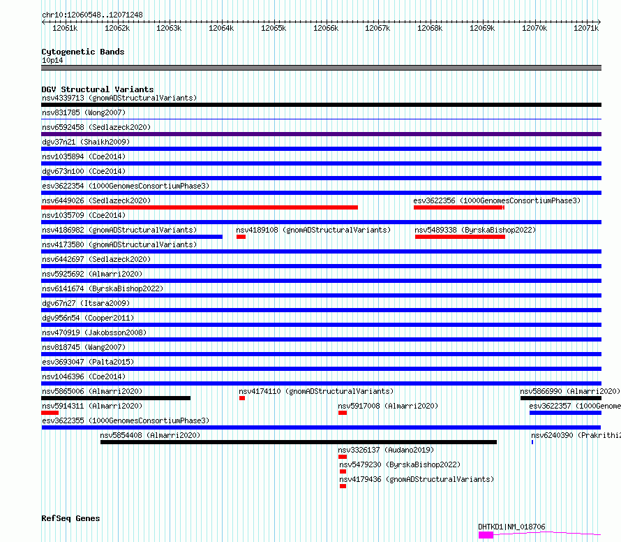 Variant DetailsVariant: esv3622355 | Internal ID | 7009214 | | Landmark | | | Location Information | | | Cytoband | 10p14 | | Allele length | | Assembly | Allele length | | hg38 | 10701 | | hg19 | 10701 |