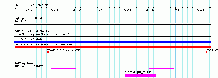 Variant DetailsVariant: esv3622970| Internal ID | 6663139 | | Landmark | | | Location Information | | | Cytoband | 10p11.1 | | Allele length | | Assembly | Allele length | | hg38 | 8050 | | hg19 | 8050 |