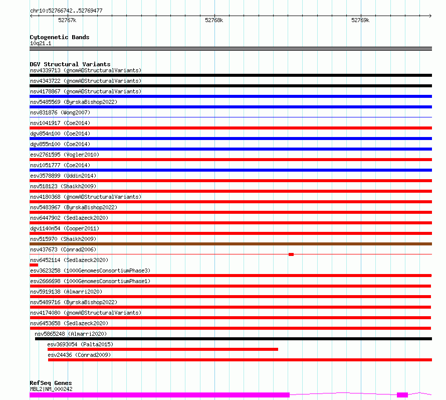 | | Variant Type | CNV loss | | Copy Number | | | Allele State | | | Allele Origin | | | Probe Count | | | Validation Flag | | | Merged Status | M | | Merged Variants | | | Supporting Variants | essv13810929, essv13810909, essv13810930, essv13810910, essv13810927, essv13810917, essv13810920, essv13810923, essv13810926, essv13810914, essv13810913, essv13810912, essv13810904, essv13810928, essv13810924, essv13810922, essv13810918, essv13810921, essv13810919, essv13810911, essv13810915, essv13810916, essv13810908, essv13810906, essv13810905, essv13810907, essv13810925 | | Samples | NA18502, NA18508, HG01602, NA18504, HG03297, HG03193, HG02952, HG01945, HG02315, NA19917, NA19247, HG02108, HG01077, HG02508, HG02968, NA18630, HG02976, HG02757, HG02557, HG03437, NA20351, HG02941, NA19759, NA19213, HG01883, HG02284, HG02343 | | Known Genes | MBL2 | | Method | Sequencing | | Analysis | | | Platform | Multiple platforms | | Comments | | | Reference | 1000_Genomes_Consortium_Phase_3 | | Pubmed ID | 21293372 | | Accession Number(s) | esv3623258