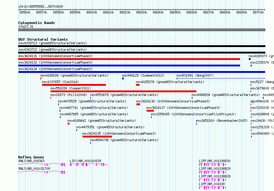 | | Variant Type | CNV gain | | Copy Number | | | Allele State | | | Allele Origin | | | Probe Count | | | Validation Flag | | | Merged Status | M | | Merged Variants | | | Supporting Variants | essv13890192, essv13890193 | | Samples | HG02309, NA20357 | | Known Genes | LIPF, LIPJ, RNLS | | Method | Sequencing | | Analysis | | | Platform | Multiple platforms | | Comments | | | Reference | 1000_Genomes_Consortium_Phase_3 | | Pubmed ID | 21293372 | | Accession Number(s) | esv3624134