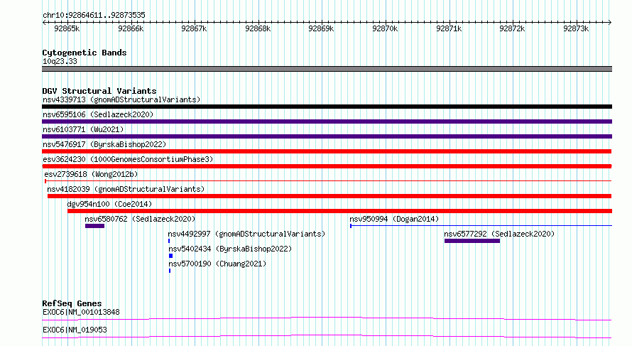 | | Variant Type | CNV loss | | Copy Number | | | Allele State | | | Allele Origin | | | Probe Count | | | Validation Flag | | | Merged Status | M | | Merged Variants | | | Supporting Variants | essv13899207, essv13899196, essv13899209, essv13899199, essv13899200, essv13899213, essv13899206, essv13899214, essv13899202, essv13899205, essv13899198, essv13899211, essv13899204, essv13899212, essv13899215, essv13899208, essv13899197, essv13899210, essv13899203, essv13899201 | | Samples | HG03773, NA20891, HG04002, HG04038, HG03796, NA20900, HG03873, HG04106, HG03696, HG04035, HG03752, HG04159, HG03866, NA20870, NA19467, HG03846, NA21125, HG03729, HG04023, HG03998 | | Known Genes | EXOC6 | | Method | Sequencing | | Analysis | | | Platform | Multiple platforms | | Comments | | | Reference | 1000_Genomes_Consortium_Phase_3 | | Pubmed ID | 21293372 | | Accession Number(s) | esv3624230