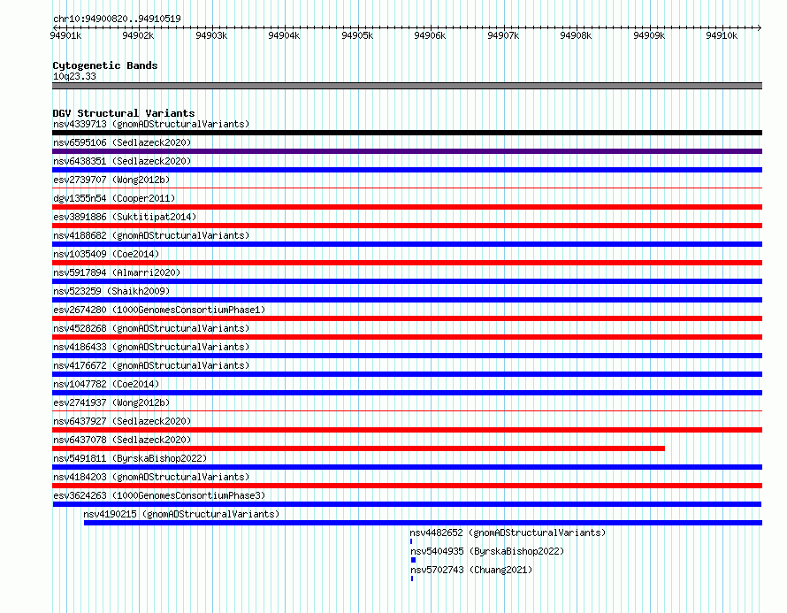 Variant DetailsVariant: esv3624263| Internal ID | 7011119 | | Landmark | | | Location Information | | | Cytoband | 10q23.33 | | Allele length | | Assembly | Allele length | | hg38 | 9700 | | hg19 | 9700 |