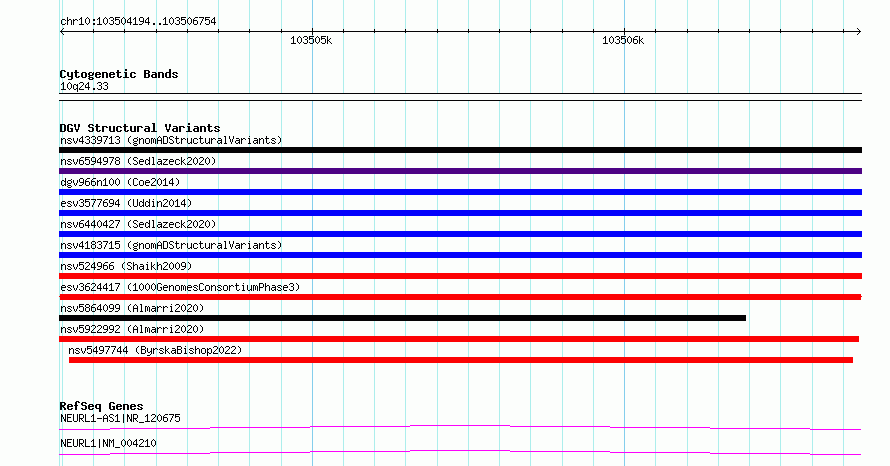 Variant DetailsVariant: esv3624417| Internal ID | 7011273 | | Landmark | | | Location Information | | | Cytoband | 10q24.33 | | Allele length | | Assembly | Allele length | | hg38 | 2561 | | hg19 | 2561 |