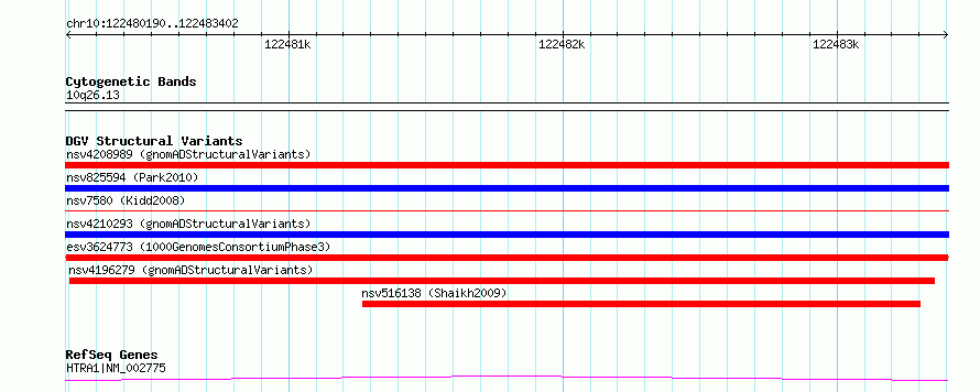 | | Variant Type | CNV loss | | Copy Number | | | Allele State | | | Allele Origin | | | Probe Count | | | Validation Flag | | | Merged Status | M | | Merged Variants | | | Supporting Variants | essv13955158, essv13955169, essv13955157, essv13955175, essv13955180, essv13955171, essv13955164, essv13955156, essv13955183, essv13955163, essv13955170, essv13955173, essv13955165, essv13955161, essv13955159, essv13955168, essv13955179, essv13955166, essv13955184, essv13955182, essv13955172, essv13955160, essv13955178, essv13955181, essv13955177, essv13955162, essv13955176, essv13955167, essv13955174 | | Samples | HG03812, NA20853, NA21127, NA20899, HG04158, HG03753, HG01586, HG03490, HG04144, HG02733, HG03691, HG03777, HG03995, NA21122, HG04062, NA20867, NA20866, HG02601, HG03653, NA21113, HG03833, HG04006, HG03702, HG01866, NA21125, NA20868, HG03977, HG03716, HG03815 | | Known Genes | HTRA1 | | Method | Sequencing | | Analysis | | | Platform | Multiple platforms | | Comments | | | Reference | 1000_Genomes_Consortium_Phase_3 | | Pubmed ID | 21293372 | | Accession Number(s) | esv3624773