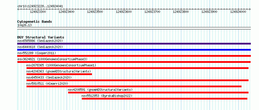 Variant DetailsVariant: esv3624821 | Internal ID | 7011671 | | Landmark | | | Location Information | | | Cytoband | 10q26.13 | | Allele length | | Assembly | Allele length | | hg38 | 814 | | hg19 | 814 |