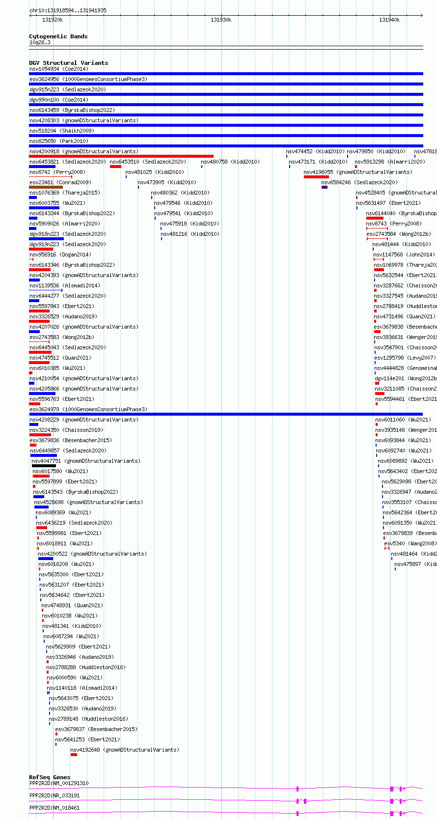 Variant DetailsVariant: esv3624979| Internal ID | 7011828 | | Landmark | | | Location Information | | | Cytoband | 10q26.3 | | Allele length | | Assembly | Allele length | | hg38 | 23342 | | hg19 | 23342 |