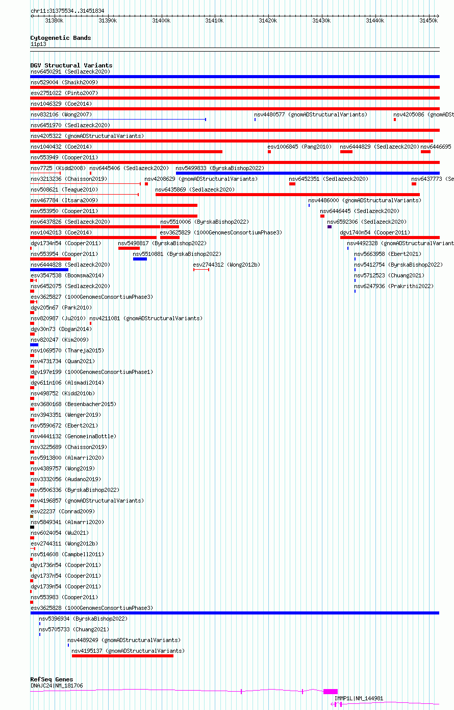 Variant DetailsVariant: esv3625828| Internal ID | 7012662 | | Landmark | | | Location Information | | | Cytoband | 11p13 | | Allele length | | Assembly | Allele length | | hg38 | 76301 | | hg19 | 76301 |